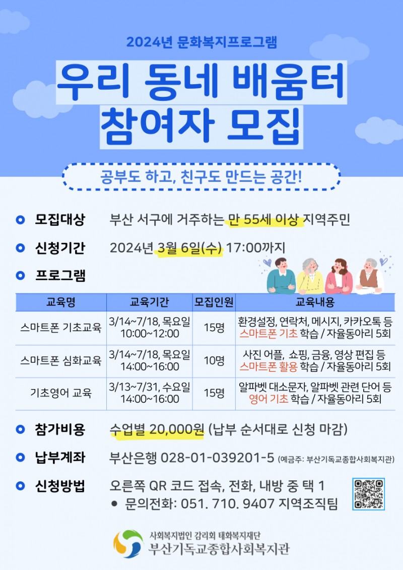 * 대상: 영어 기초를 배우고 싶은 만 55세 이상 서구 지역주민 15명