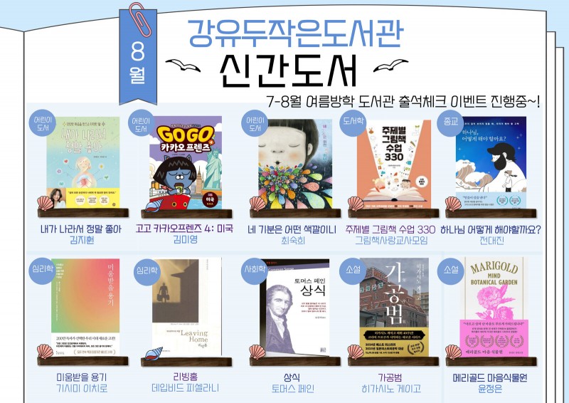 7-8월 여름방학 맞이 도서관 출석체크 이벤트도 계속 진행 중이니 강유두작은도서관에 놀러오세요~!