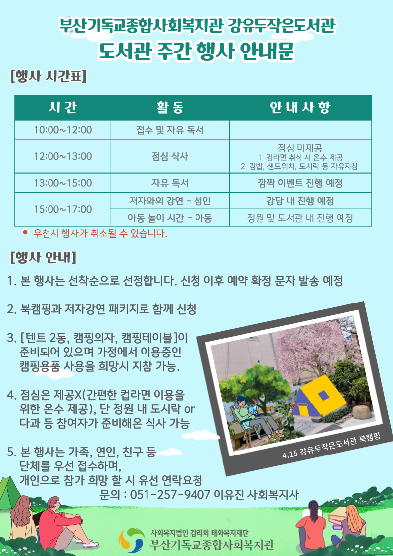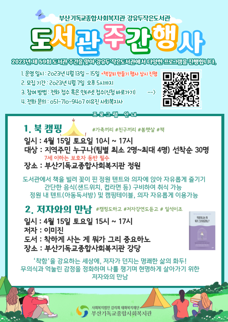 2023년 도서관주간을 맞이하여 강유두작은도서관에서 '북캠핑&저자강연'을 진행합니다 :)