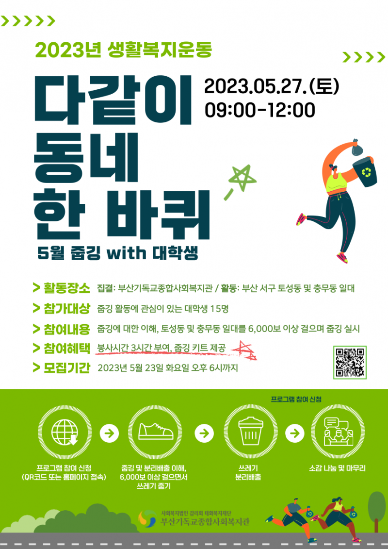 부산기독교종합사회복지관에서 '다같이 동네 한 바퀴(줍깅)' 활동에 함께할 대학생을 모집합니다.