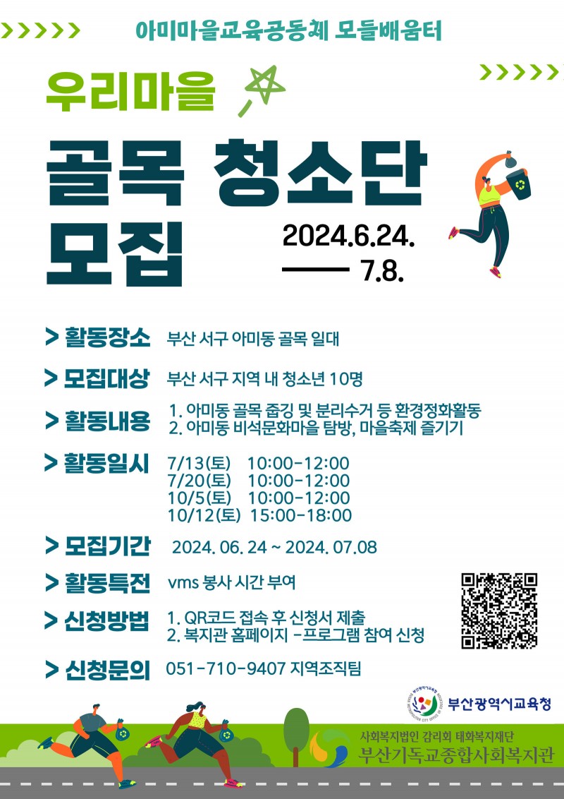 아미마을교육공동체 모들배움터 회원과 함께 아미동 마을 골목 구석구석 줍깅과 분리배출을 통해 환경 정화 활동을 실천할 15명의 '우리마을 골목청소단'을 모집합니다!