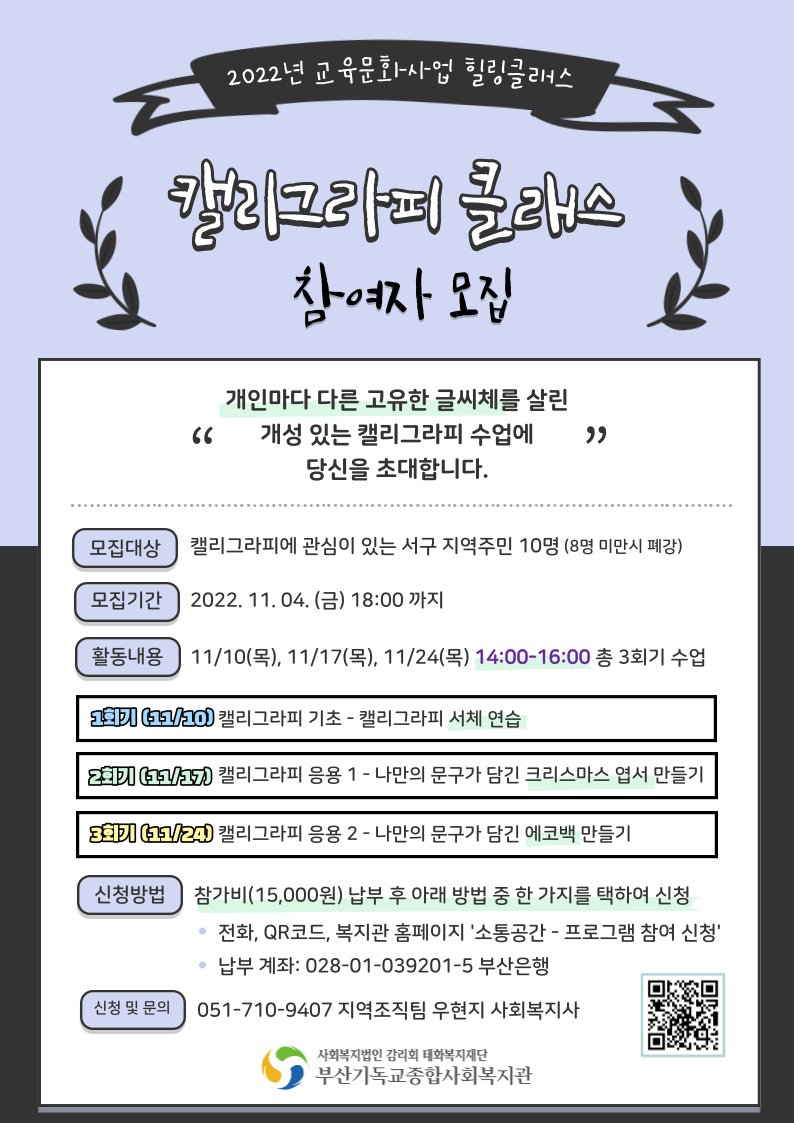 3주간 온전히 나만의 여가 시간을 보낼 수 있는 ‘캘리그라피 클래스’로 주민 여러분을 초대합니다.