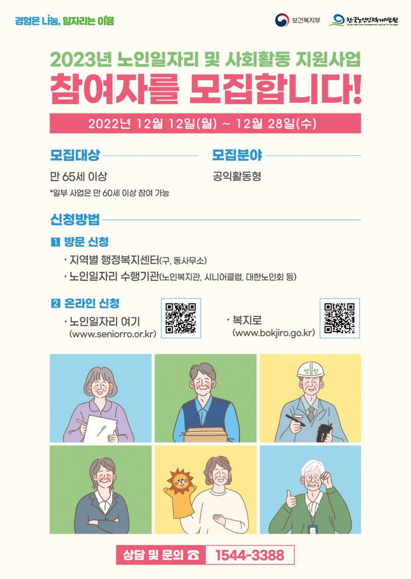 공지 2023년 노인일자리 및 사회활동지원사업 참여자를 모집합니다.