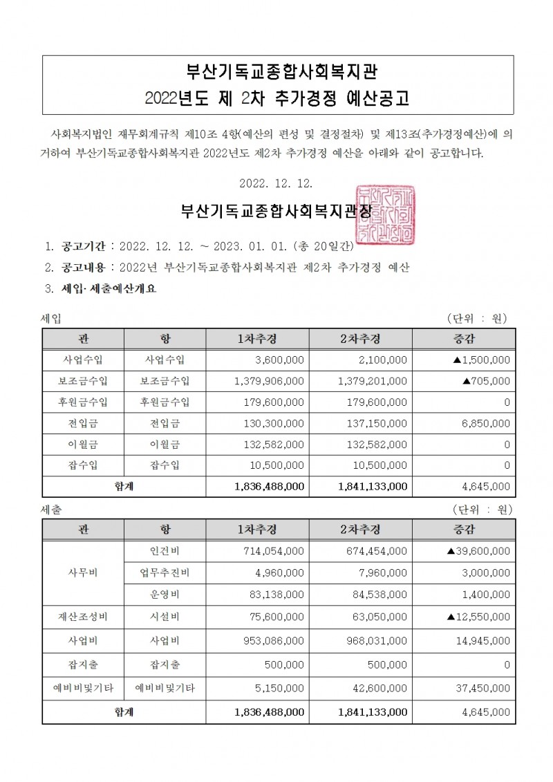 목록 공시 부산기독교종합사회복지관 2022년도 제2차 추가경정 예산공고 페이지 정보 최고관리자 조회 1,107 입력 2022-12-12 11:11 댓글 0 본문 목록 이전글부산기독교종합사회복지관 계약직(육아대체인력) 채용 공고 2022.12.20 다음글2023년 노인일자리 및 사회활동지원사업 참여자를 모집합니다. 2022.12.07 댓글 (0) 댓글목록 등록된 댓글이 없습니다.