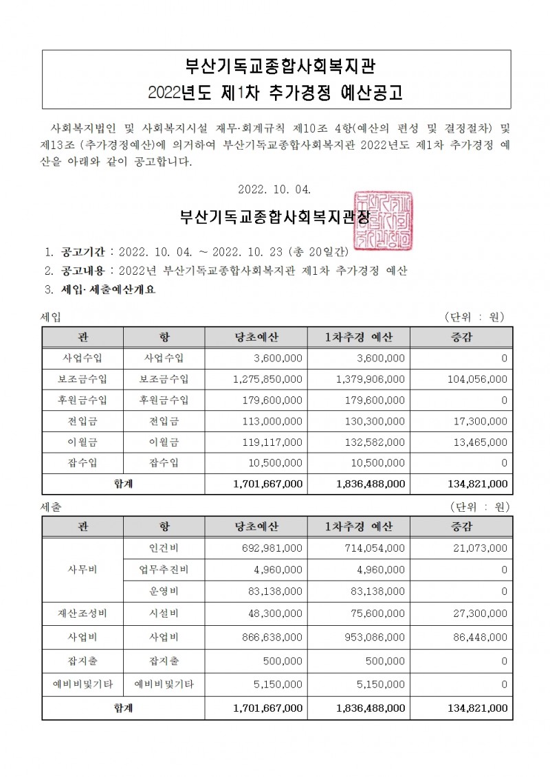 목록 공시 부산기독교종합사회복지관 2022년도 제1차 추가경정 예산공고 페이지 정보 최고관리자 조회 1,086 입력 2022-10-04 16:01 댓글 0 본문 목록 이전글2022년도 제3차 부산기독교종합사회복지관 운영위원회 보고 2022.10.08 다음글2022년 간이스프링클러 설치공사 실시 안내 2022.09.27 댓글 (0) 댓글목록 등록된 댓글이 없습니다.