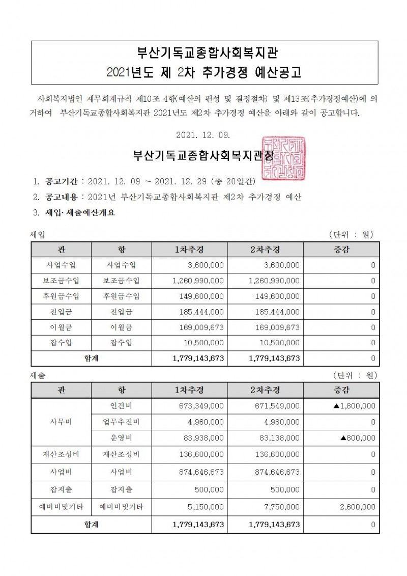 목록 부산기독교종합사회복지관 2021년 제 2차 추가경정 예산공고 페이지 정보 최고관리자 조회 1,110 입력 2021-12-09 13:15 댓글 0 본문 사회복지법인 재무회계규칙 제10조 4항(예산의 편성 및 결정절차) 및 제13조(추가경정예산)에 의거하여 부산기독교종합사회복지관 2021년도 제2차 추가경정 예산을 아래와 같이 공고합니다. 목록 이전글부산기독교종합사회복지관 정규직 사회복지사 채용 공고 2021.12.10 다음글2021년 기부금 영수증 발급 안내 2021.12.07 댓글 (0) 댓글목록 등록된 댓글이 없습니다.