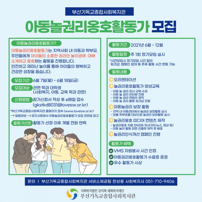 • 활동가 혜택: VMS 자원봉사 시간 인정, 아동놀권리옹호활동가 수료증 증정, 우수 활동가 시상 등