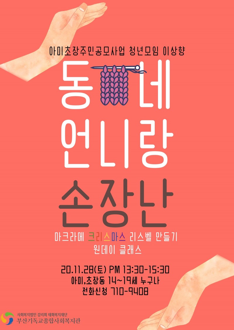목록 동네언니와 손장난 클래스 모집 페이지 정보 최고관리자 조회 1,960 입력 2020-11-19 09:39 댓글 0 본문 아미동, 초장동 십대들을 위해동네 언니들이 떴다!십대들과 함께 마크라메 원데이 클래스,"동네언니와 손장난"의 참여자를 모집합니다. 동네언니, 누나와 함께 이야기 나누며 손장난 해 볼 동네 십대들의 참여를 기다립니다. 신청방법 : 전화신청(710-9408) 목록 이전글2021년 노인급식사업 급식납품업체 입찰 공고 2020.11.27 다음글2021년 노인일자리 및 사회활동지원사업 참여자를 모집합니다. 2020.11.16 댓글 (0) 댓글목록 등록된 댓글이 없습니다.