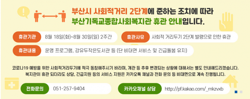 부산시 사회적거리 2단계에 준하는 조치에 따라 부산기독교종합사회복지관 휴관 안내입니다.