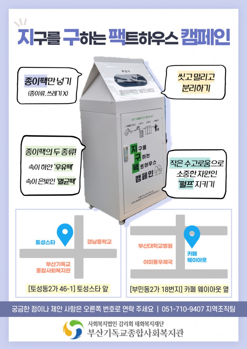 부산기독교종합사회복지관에서는 생활복지운동 자원순환거점을 확대 운영하기 위해 대형 종이팩 수거함을 제작하였습니다.