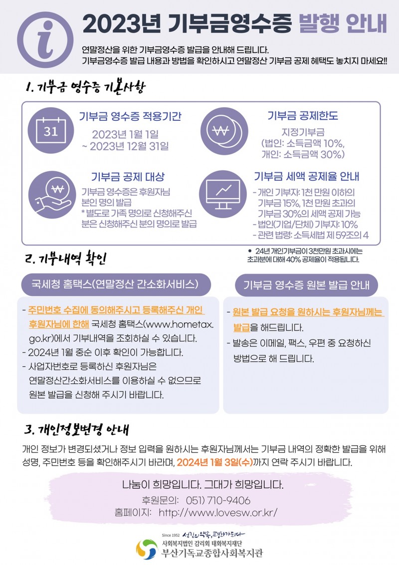 - 기부금 영수증 적용기간: 2023년 1월 1일~2023년 12월 31일