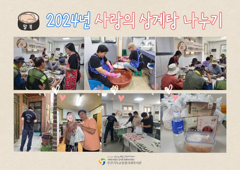 말복을 맞이하여 어르신들의 건강을 위해 삼계탕과 밑반찬, 음료를 지원하였습니다.