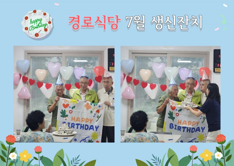 날이 무더워지는 7월, 경로식당에서는 어르신들의 생신을 축하해드리는 시간을 가졌습니다.