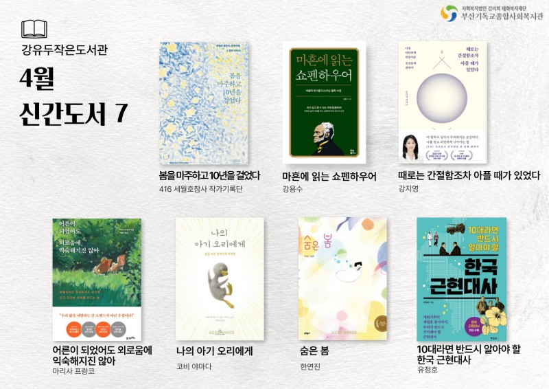 목록 강유두작은도서관 4월 신간 안내 페이지 정보 최고관리자 조회 759 입력 2024-04-05 17:46 댓글 0 본문 4월을 맞이한 강유두작은도서관엔신간이 입고 되었습니다.이용자의 추천을 받아 매월 구입하고 있는 도서관 신간과 함께4월의 추천도서와 더불어 '함께 기억하기' 위한작은 이벤트까지 진행 중인 강유두작은도서관에 놀러오세요. 목록 이전글또바기연합봉사단 발대식 및 연합활동 진행 2024.04.08 다음글2024년 꿈디자이너 비전원정대 - 문화공연 2024.04.03 댓글 0 댓글목록 등록된 댓글이 없습니다.
