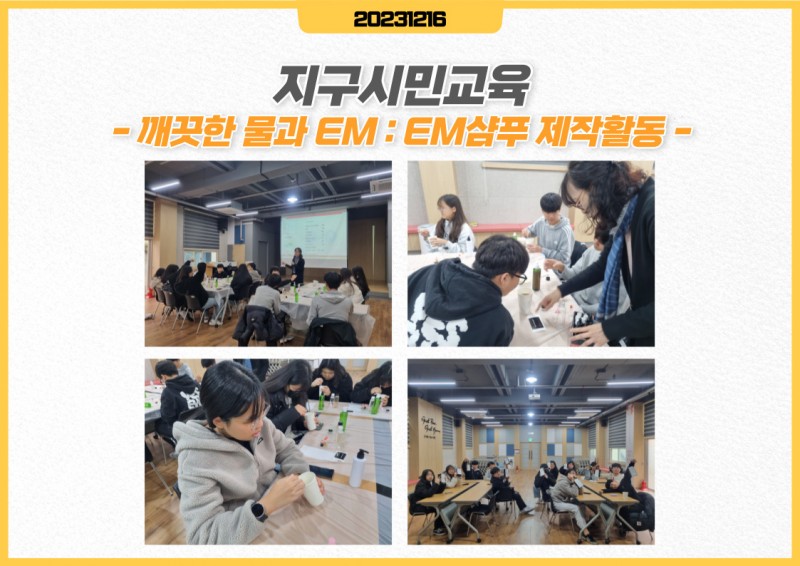 시험이 끝나고 다시 한 자리에 모인 지구시민학교! 오늘은 '깨끗한 물과 EM' 이라는 주제로 EM이 무엇인지, 환경에 어떠한 영향을 미치는지 함께 배워보고 내 몸과 지구를 지키기 위한 착한 'EM 샴푸'를 만들어보았습니다.