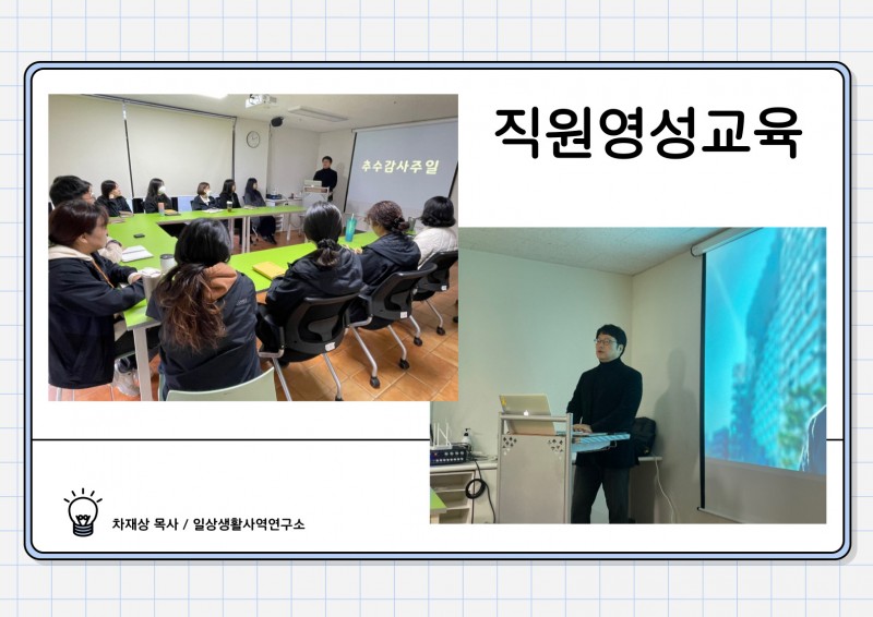 추수감사주일을 맞이해 일상생활사역연구소 차재상 목사님을 모시고 직원영성교육의 시간을 가졌습니다.