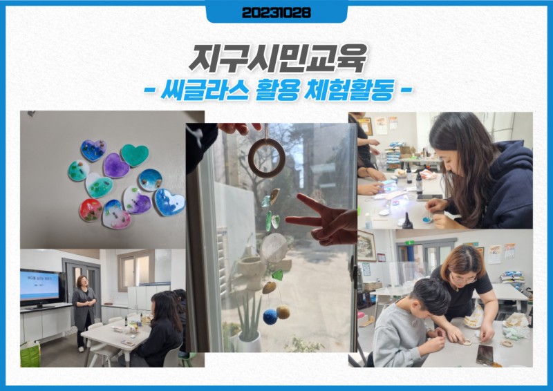 무더운 여름날에 진행했던 송도 줍깅과 연관하여 해변의 유리조각인 '씨글라스'를 활용한 업싸이클링 체험활동을 진행하였는데요. 씨글라스 그립톡과 모빌을 만들어 보면서 쓰레기를 어떻게 재탄생시킬 수 있을지 고민해보는 시간을 가졌습니다. 앞으로도 물과 에너지에 대해 더 재밌게 알아갈 지구시민이들의 활동도 기대해주세요~!
