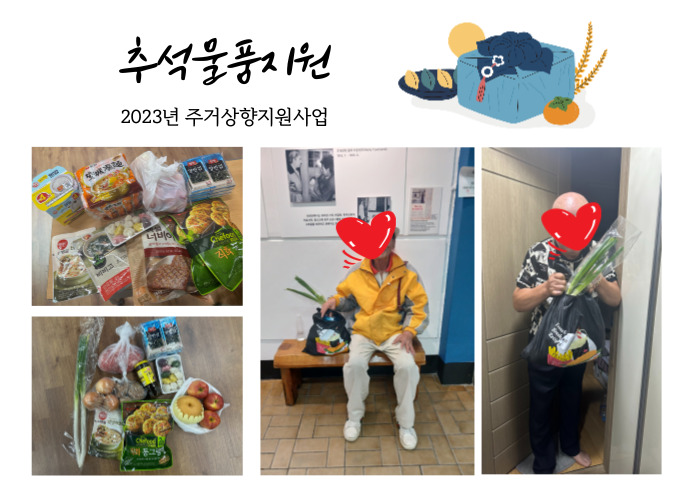 2023년 추석을 맞이하여 주거상향지원사업에 참여하고 있는 이용자 45명에게 추석기간 드실 식료품과 함께 추석 안부인사를 전하였습니다.