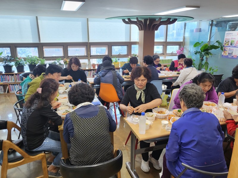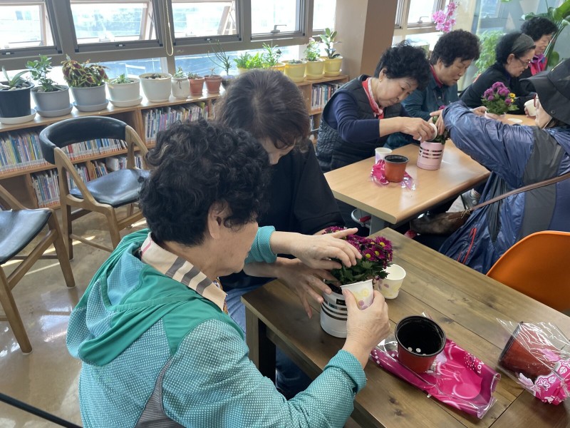 오늘은 웃음치료 레크레이션을 통해 왁자지껄 웃고 떠들며 활력을 얻고, 나만의 화분 만들기를 통해 예쁜 국화 화분을 만들고, 함께 점심으로 맛있는 회덮밥을 나눠먹으며 몰랐던 이웃들과 만나는 즐거운 시간을 가졌습니다.
