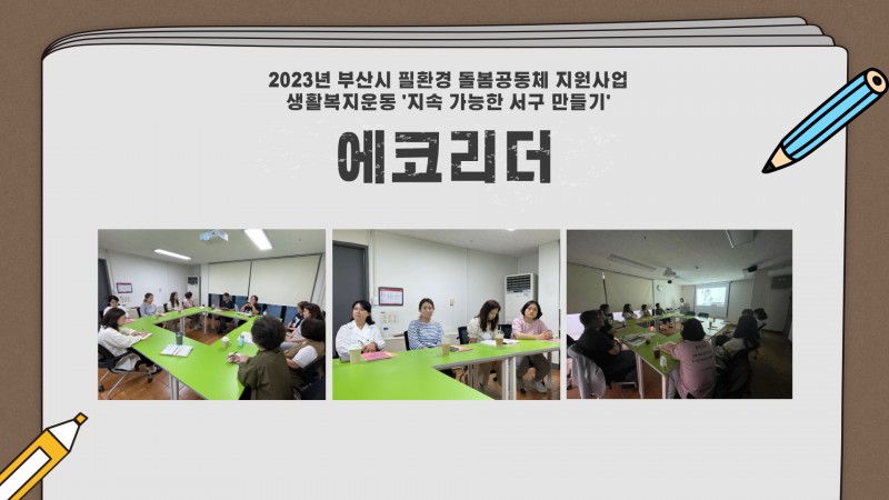 2023년 부산시 필환경 돌봄공동체 지원사업 생활복지운동 '지속 가능한 서구 만들기' 사업에서 지역 주민과 직접적으로 함께 의견을 나누고 다양한 활동을 만들어갈 수 있는 동아리 '에코리더'의 첫 모임이 진행되었습니다!