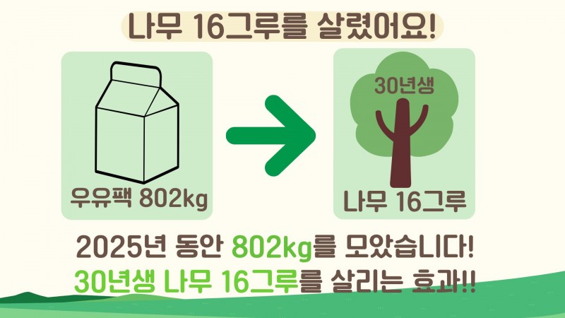 2025년에도 지역 내 카페와 지역주민들이 참여해주신 덕분에 우유팩 802kg를 수거하였고