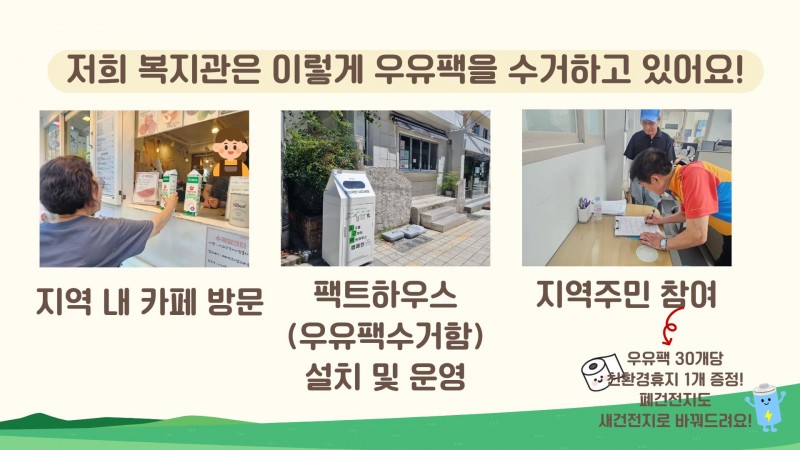 우유팩으로 대표되는 종이재질의 살균팩, 두유팩으로 대표되는 은박재질의 멸균팩을 모아서 복지관에 가져오세요!