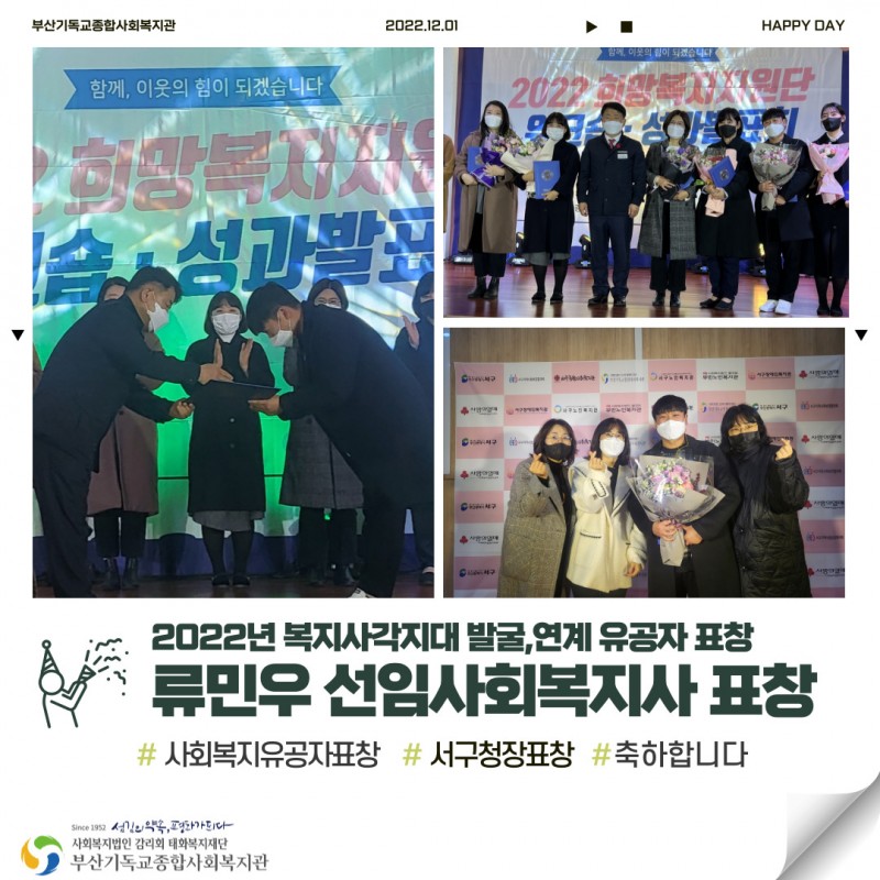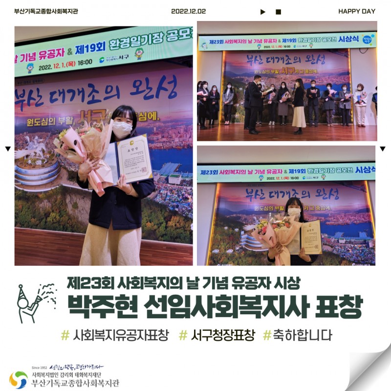 목록 류민우, 박주현 선임 사회복지사 사회복지유공자 표창 수여 페이지 정보 최고관리자 조회 1,196 입력 2022-12-03 10:12 댓글 0 본문 부기사에 축하할 일들이 가득합니다. ^^지역조직팀 류민우 선임 사회복지사와 박주현 선임 사회복지사가 부산서구청장으로부터 사회복지유공자 표창을 받았습니다. 마을 구석구석 누비며 주민조직화를 통해 복지사각지대 발굴 및 연계에 힘쓰기도 하고 새로운 사회적 문제인 기후위기에 맞서 지역사회에서 청소년과 주민들을 독려하여 환경사업을 지속하고 있는 류민우 선임 사회복지사와 박주현 선임 사회복지사, 두 사람에게 아낌없는 격려와 응원의 박수를 보냅니다. ^^함께 축하해주세요! 목록 이전글아동권리형 나눔마켓 '초록이점빵' 3회기 실시 2022.12.06 다음글22년 이웃과 함께하는 사랑의 김장김치 나누기 2022.12.02 댓글 0 댓글목록 등록된 댓글이 없습니다.