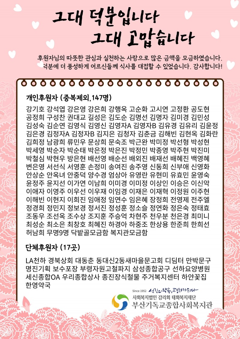 덕분에 123분이라는 어르신들께 직접 꽃과, 식사 그리고 효 꾸러미박스(다과)를 드릴 수 있었습니다.