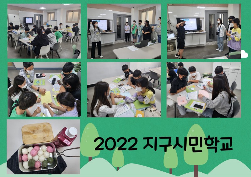 매 시간 지구시민학교에선 제로웨이스트를 실천하고 건강한 먹거리를 나눌 수 있도록 모든 소재가 재활용되는 기픈물과 다회용기에 담긴 꿀떡을 간식으로 함께 나눴습니다^^