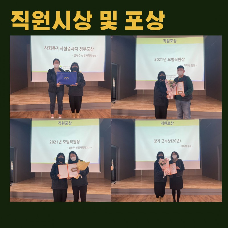 외부 시상과 더불어 2021년 모범직원상(이희진 팀장, 김은주 선임사회복지사)과 20년 장기근속상(신동희 부장)을 축하했습니다. 아쉽지만 새로운 삶을 시작하기 위해 퇴사하는 직원과 육아휴직으로 잠시 떨어져 지낼 최혜진 과장님을 위해 함께 축복하는 시간도 마련했습니다.