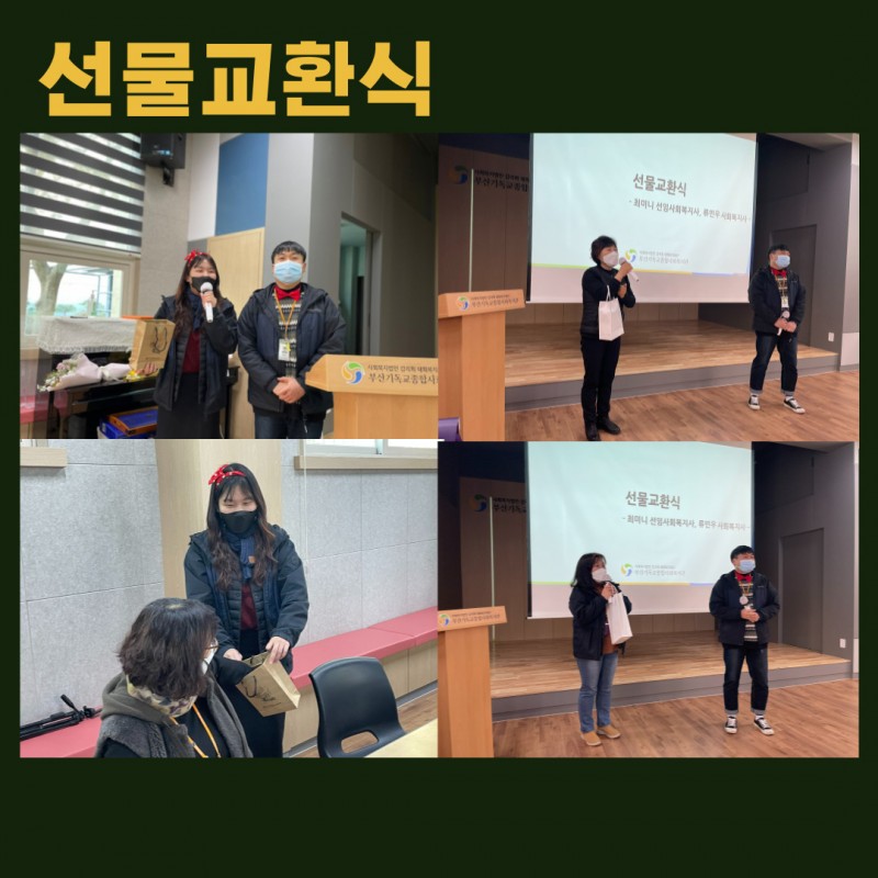 김정자 관장님의 기도로 시작하여 "2021년 한 해를 돌아보며"라는 주제의 사업보고 영상으로 한 해의 사업을 공유하고 격려하는 시간을 가졌습니다. 이후 최미니 선임사회복지사와 류민우 사회복지사의 유쾌한 진행으로 선물교환식과 함께 한 해 감사했던 일들을 나누기도 했습니다.
