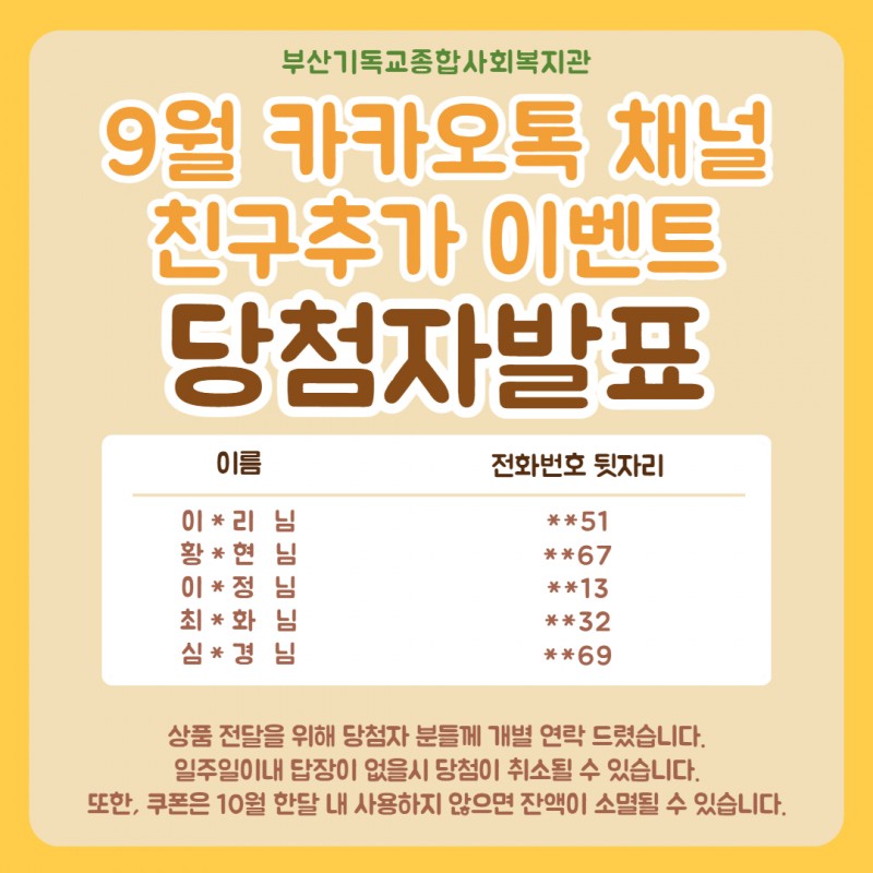 9월 카카오톡 채널 친구추가 이벤트 당첨자 발표