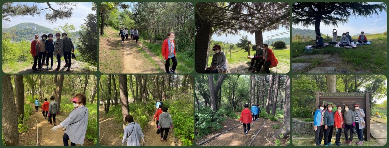 산책로에 진입하기 전 다 같이 모여 가볍게 몸풀기 체조를 시작하고 두 명씩 짝지어서 산책로 코스를 출발하도록 했습니다. 서로 친한 사람들이 짝이 되는 반면에, 친하지 않은 사람과도 같이 짝이 되어 이야기를 나누고, 친분을 쌓게 되었습니다. 가파르고 위험하지 않은 곳이라 어르신들은 편하게 다녀올 수 있었고 그늘 진 곳에 모여 명상의 시간까지 가지면서 자연과 하나 되어 마음을 다스리는 방법을 배웠습니다.
