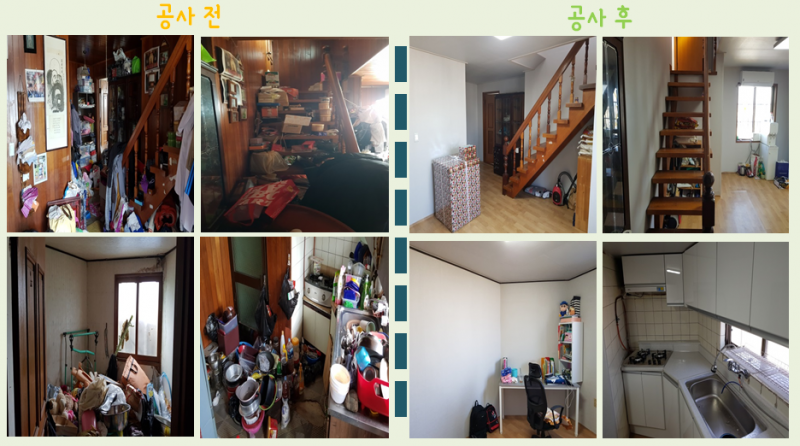 곰팡이가 여기저기 슬어있던 벽지와 우중충한 목조를 떼어내고 따뜻하고 화사한 톤의 벽지로 교체하였고 단열제를 보강하여 여름은 시원하게, 겨울에는 따뜻한 집이 되도록 하였습니다. 뿐만아니라 낡은 가구들을 비워내고 새로운 수납장과 창문, 싱크대를 교체해 쾌적하고 위생적인 생활이 가능하도록 지원하였습니다. 고등학생인 민지(가명)에게 더 열심히 공부할 수 있도록 책상과 학용품 세트도 선물했습니다.