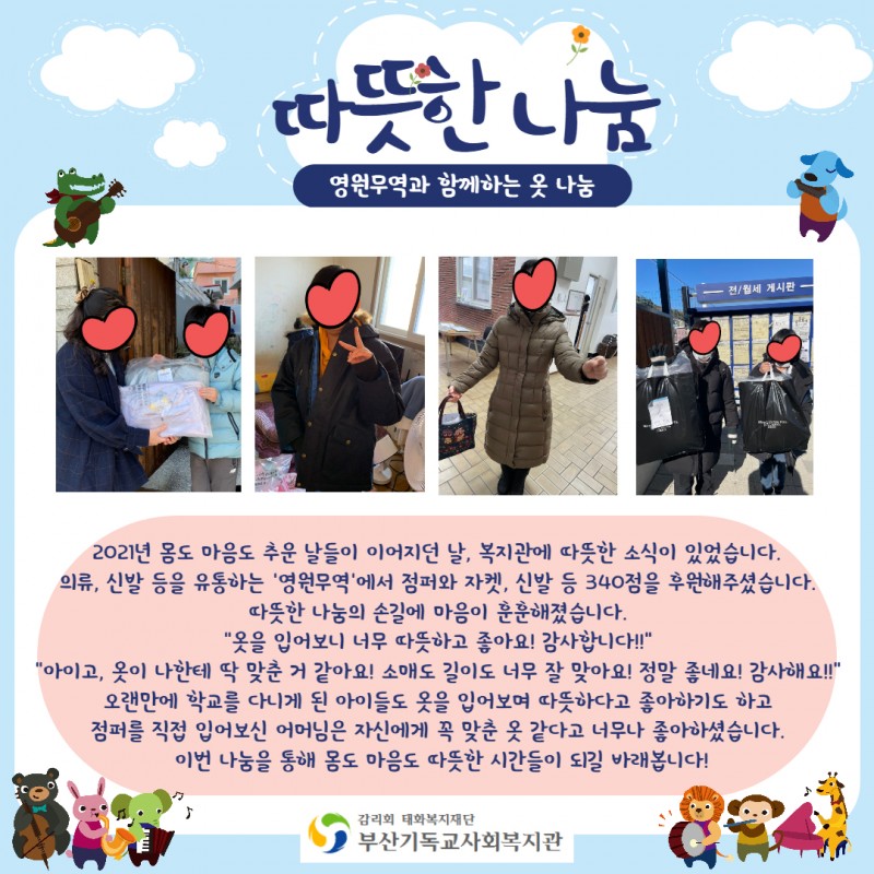 목록 2021년 따뜻한 옷 나눔(영원무역) 페이지 정보 최고관리자 조회 1,107 입력 2021-02-10 10:30 댓글 0 본문 - (주)영원무역의 후원으로 진행되었습니다 - 목록 이전글2020년 아미초장청소년마을학교 - 유유자적프로젝트 성장발표회 2021.02.15 다음글주거환경개선사업 '집다운 집으로' 2021.02.04 댓글 0 댓글목록 등록된 댓글이 없습니다.
