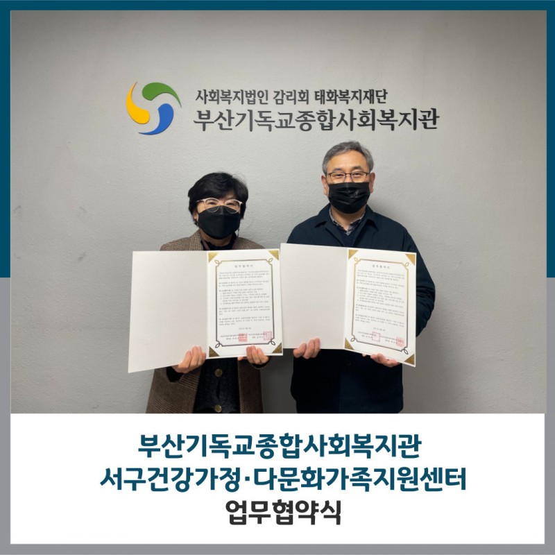 3/4(목) 부산서구건강가정·다문화가족지원센터와 부산기독교종합사회복지관은 서구주민의 복지증진 및 가족기능강화를 위한 통합지원체계를 구축하고자 업무 협약을 맺었습니다.