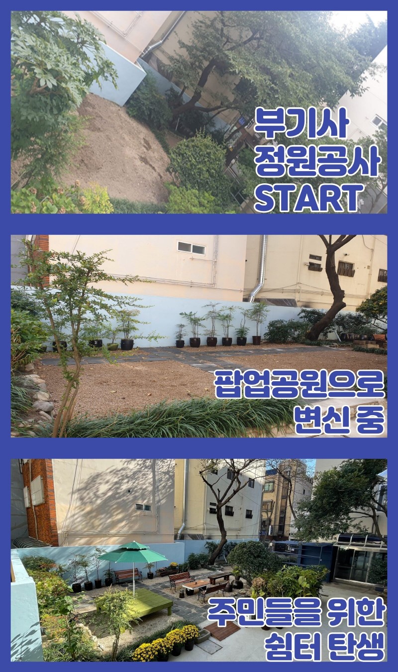 부산기독교종합사회복지관의 텃밭이었던 작은 공간이, 지역주민들이 이용할 수 있는 쉼터이자 공원으로 새롭게 탄생했습니다. 공원이 턱없이 부족한 서구의 특성상 주민들이 앉아서 쉬며 차 한 잔 할 수 있는 벤치도 찾아보기 힘들었던 우리 동네에 작은 쉼터가 생겼습니다. 어르신들이 지나가다 쉬어 가기도 하며, 아이들이 강유두작은도서관에서 책을 빌려 평상에 엎드려 읽기도 하며 복지관 바로 앞 상점 직원들의 점심시간의 휴게실도 되는 우리 동네 팝업공원으로 재탄생했습니다.