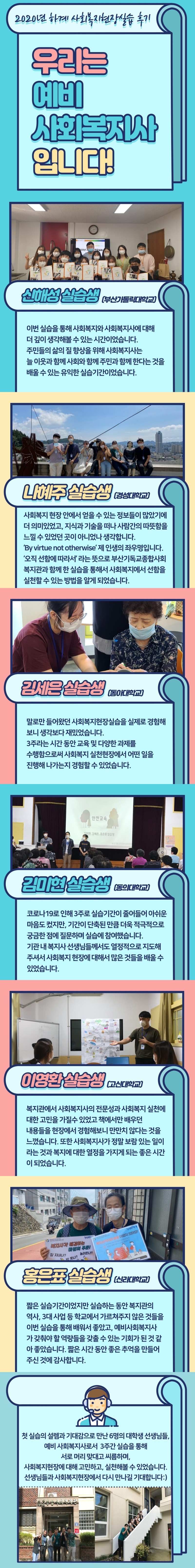 목록 2020년 하계 사회복지현장 실습생 후기 페이지 정보 최고관리자 조회 1,221 입력 2020-08-24 11:24 댓글 0 본문 지난 7월13(월)~31일(금) 3주간 사회복지현장실습이 진행되었습니다. 실습생 후기를 통해 3주동안의 생생한 실습현장을 느껴 보세요~^^ 목록 이전글2020년 제 2회 서·중구 학교 통합사례회의 실시 2020.08.26 다음글유유자적 프로젝트 슬기로운 집콕 생활 2020.08.20 댓글 0 댓글목록 등록된 댓글이 없습니다.