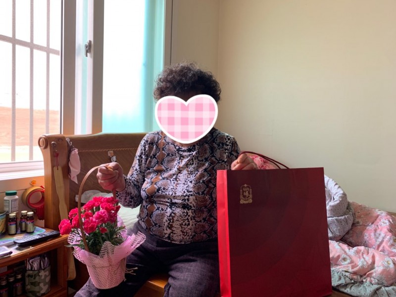 어버이날 혼자 계시는 어르신에게는 카네이션과 감사의 엽서와 함께 부족한 영양을 챙길 수 있도록 영양제도 함께 선물하였습니다.
