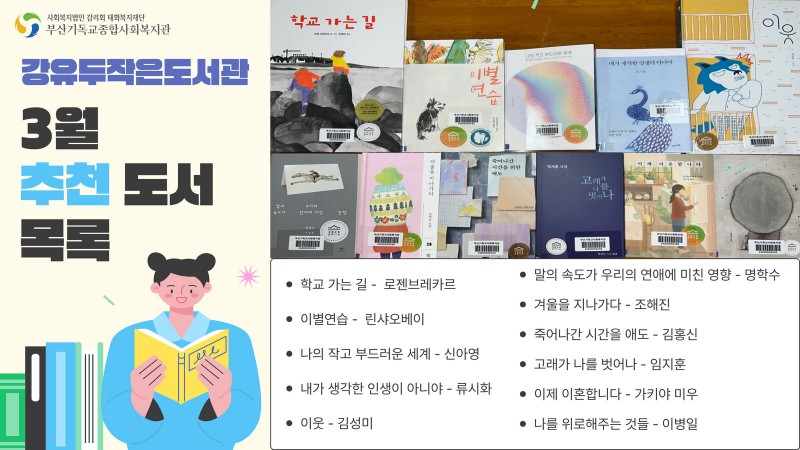 목록 강유두작은도서관 3월 추천도서 페이지 정보 최고관리자 조회 163 입력 2025-03-11 11:32 댓글 0 본문 강유두작은도서관 3월 추천 도서입니다~!따뜻한 봄날의 햇살처럼 따뜻한 글귀의 책들이 가득 기다리고 있는 강유두작은도서관으로 놀러 오세요~^^ 목록 이전글[2025년 소식지] 어울림 25호 '함께 어울림' 2025.03.13 다음글2025년 여성, 날다 오리엔테이션 2025.03.05 댓글 0 댓글목록 등록된 댓글이 없습니다.