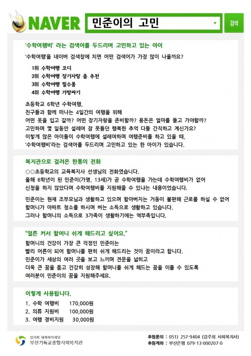 목록 수정 삭제 민준이의 고민 게시판 리스트 옵션 수정 삭제 페이지 정보 관리자 조회 2,313 입력 2014-03-11 18:11 댓글 0 본문 다시 돌아오지 않을 민준이의 첫 수학여행의 설레임에 함께 해주세요^^ 많은 분들의 따뜻한 관심과 후원으로 민준이의 소중한 꿈을 향해 내딛는 첫 여행에 동행해주세요. 문의:김주희 사회복지사(051-257-9404) 목록 수정 삭제 이전글번동5단지종합사회복지관 마을공동체 방문 2014.03.18 다음글2/25(수) 친한친구교실 2기 멘티·멘토 문화체험 실시 2014.03.03 댓글 0 댓글목록 등록된 댓글이 없습니다.