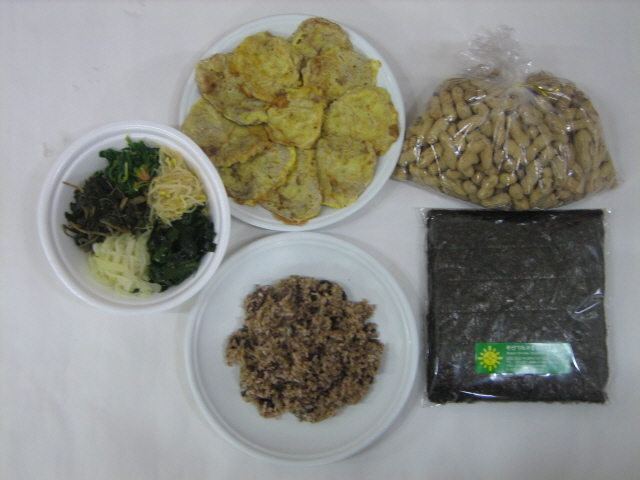 복지관에서 직접 조리하고 포장한 음식들로 오곡밥에
