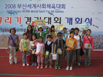부산에서 열리고 있는 세계사회체육대회 연날리기 대회에 참가한 홍콩 나라의 서포터즈를 하며 열심히 응원하였답니다.