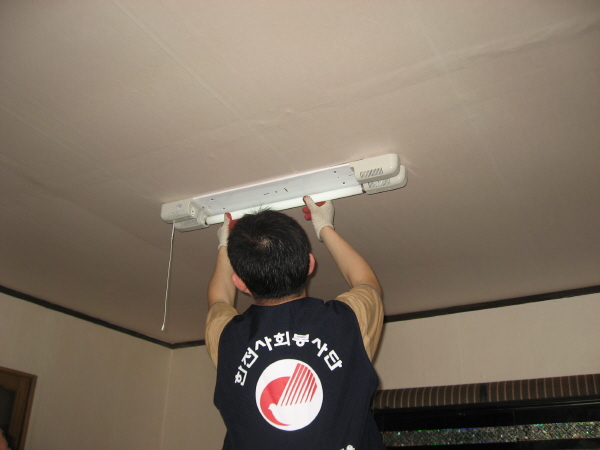 무더운 날씨에도 불구하고 5개조로 나누어 가정방문을 실시하여 전등 리모콘 설치작업을 하고 노후된 전등과 전선을 교체해 주는 일들을 하였습니다.