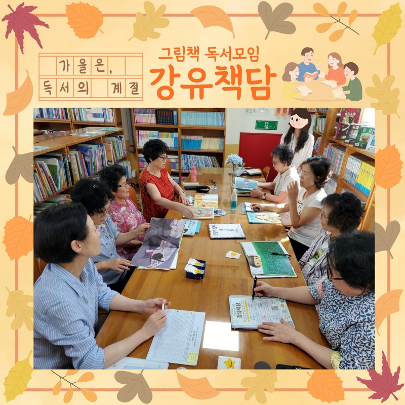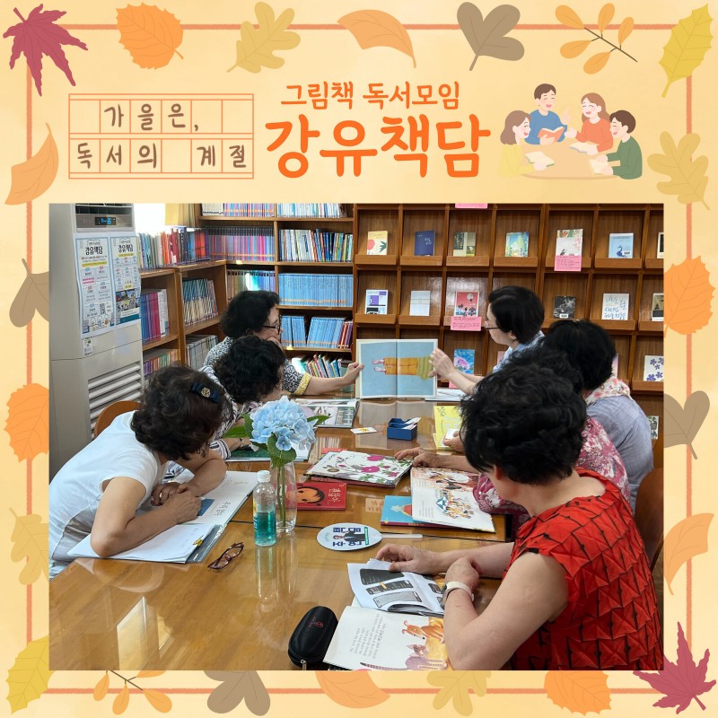 가을은 독서의 계절인만큼 강유두작은도서관에서 그림책과 함께 담소를 나누는 어른들의 힐링독서모임 '강유책담'이 진행되고있습니다~
