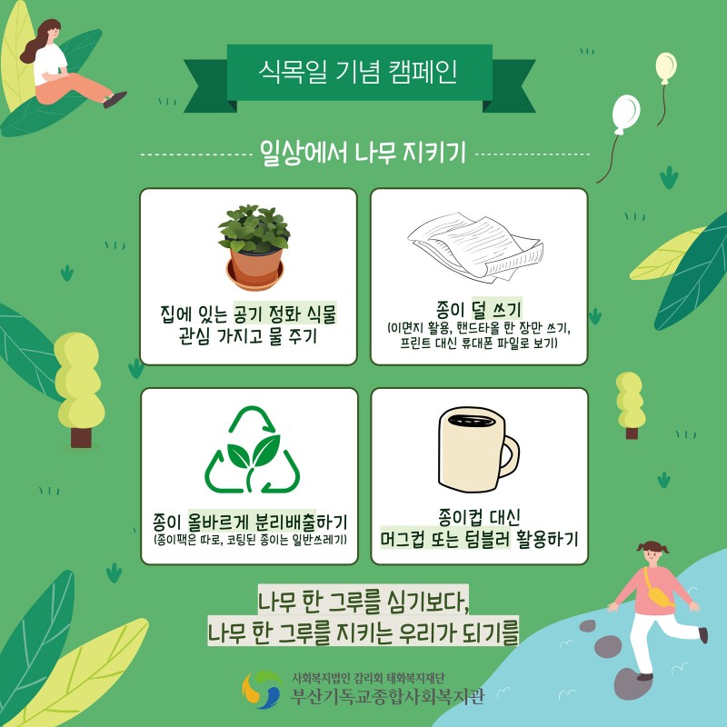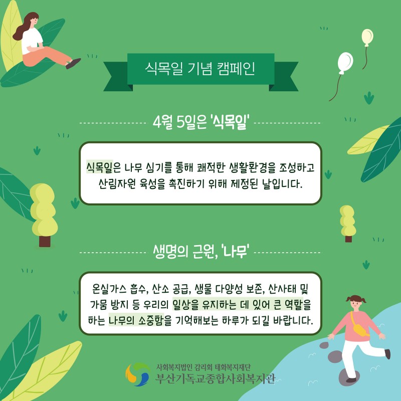 '나무는 심는 것보다 베지 않고 보호하는 것이 중요하다.'라는 말처럼 지금 당장 나무를 심을 수는 없더라도 나무 한 그루를 '지킬 수 있는 방법'을 함께 알아보고 실천해보는 의미있는 하루가 되길 기대해봅니다! :)