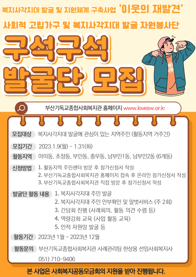 복지사각지대 발굴 및 지원체계 구축사업 이웃의 재발견에서 '구석구석 발굴단'을 모집합니다!