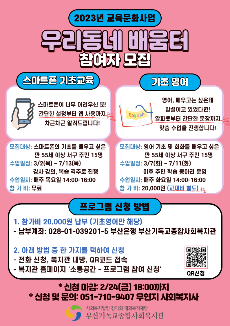 * 대상: 영어 기초 및 회화를 배우고 싶은 만 55세 이상 서구 주민 15명