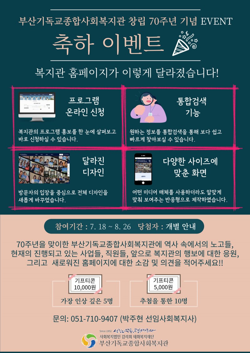 부산기독교종합사회복지관 창립 70주년 축하, 홈페이지 새 단장 의견 남기기 이벤트!